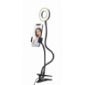 Anillo LED para selfies con soporte para teléfono incorporadoBrazos flexibles para soporte para teléfono y anillo para selfiesPrácticos botones para cambiar la intensidad de la luz, el color (frío / cálido) y el interruptor de encendido / apagado