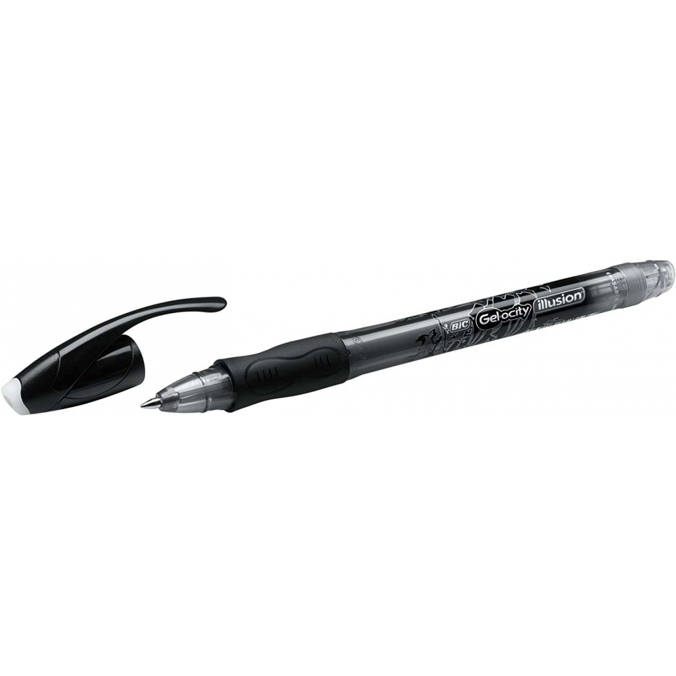 Bic Gel-ocity Illusion Boligrafo de Tinta Gel Borrable - Punta Media de 0.7mm - Recargable - Grip de Goma - Clip de Plastico - Color Negro
