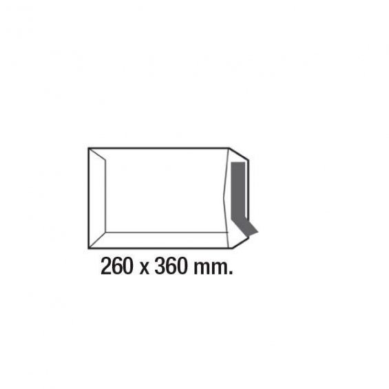 Bolsas folio prolongado fabricadas en papel kraft con medida 260 x 360 mm y gramaje de 90 g. La solapa es recta y su tipo de cierre es con tira de silicona. No tiene ventana. La caja contiene 250 bolsas.